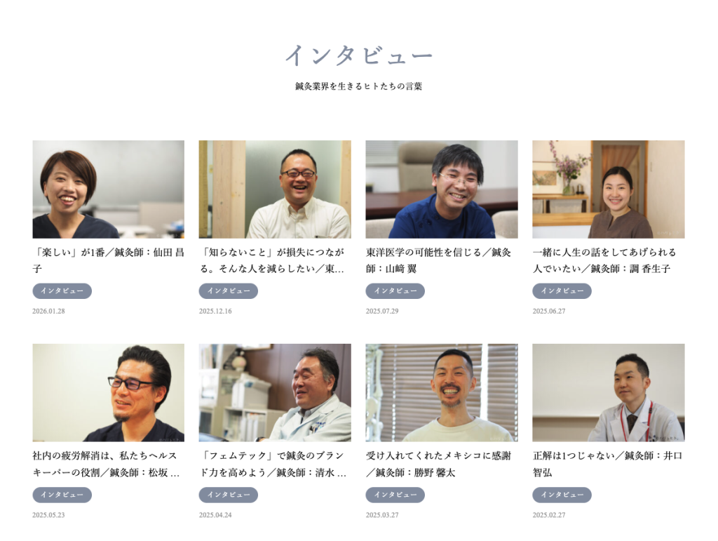 Contents:2019年3月にスタートした、鍼灸師向けのwebメディア。鍼灸師・鍼灸関連企業などへのインタビューを通して、鍼灸師のキャリアパスを応援している。